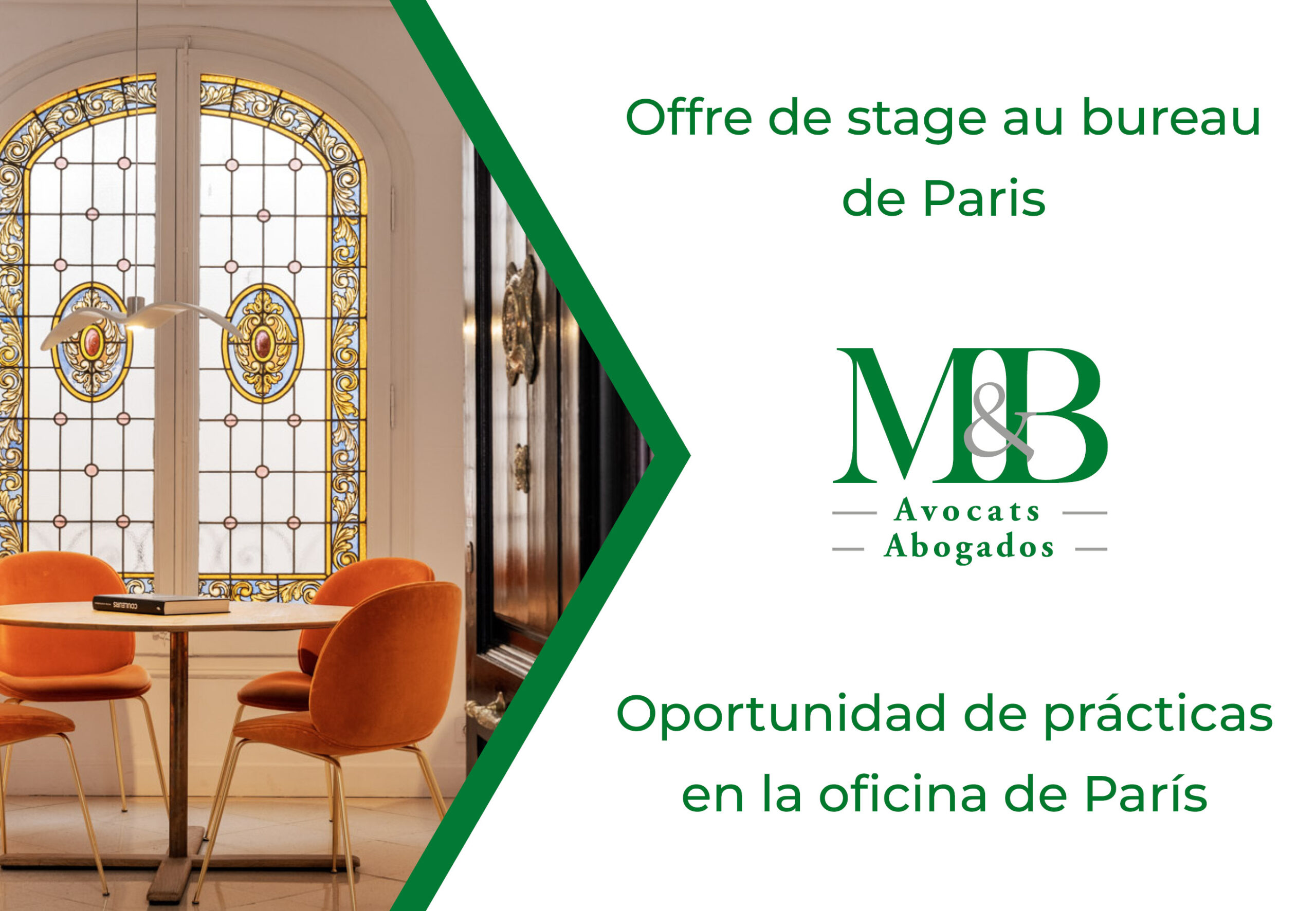 El despacho M&B Abogados – M&B Avocats busca un@ becari@ bilingüe (castellano/francés) para su oficina de París, por un periodo de prácticas de seis meses desde julio de 2026.